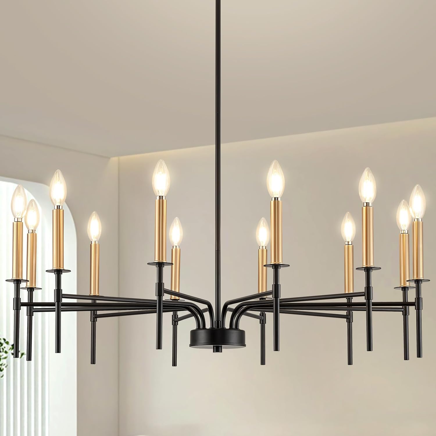 - Modern Classic Candle Chandelier Design: ONESMING black and gold chandelier light fixture is inspired by candle light decorations, easy to get an ever-changing sense of ambiance. The entire lamp body is made of sturdy metal for a solid structure, with 12 round wrap-around candelabras and an easy-to-operate stable extendable pole. The combination of black and gold finishes not only complements a variety of modern minimalist interior design styles, but also enhances the overall beauty of the chandelier, making it a visually stunning centerpiece