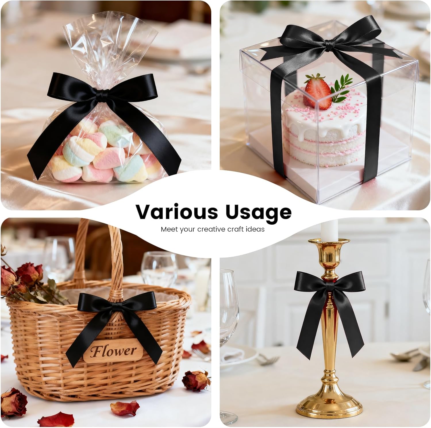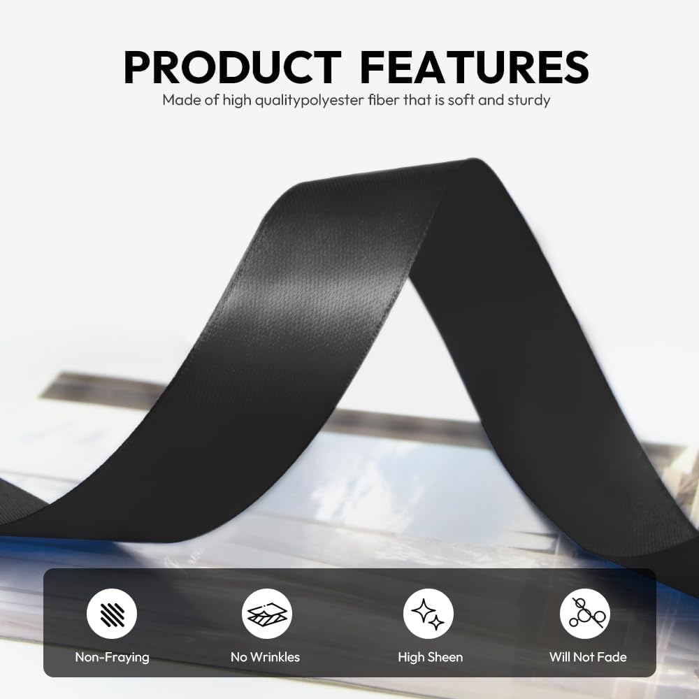 - 【High Quality】: Our fabric satin ribbon is made of 100% high-quality polyester. The single face ribbon for gift wrapping is Black color and has smooth texture which is easy to cut and use.