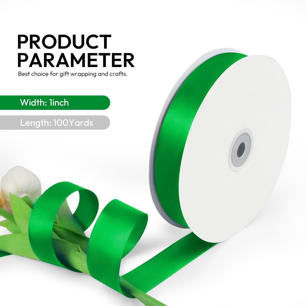 1 Inch 100 Yards Satin Ribbon Green, Solid Color Fabric Ribbon for Gift Wrapping, Wedding, Polyester Gift Ribbon for Birthday Party Decoration, Craft, Hair, Floral, Sewing