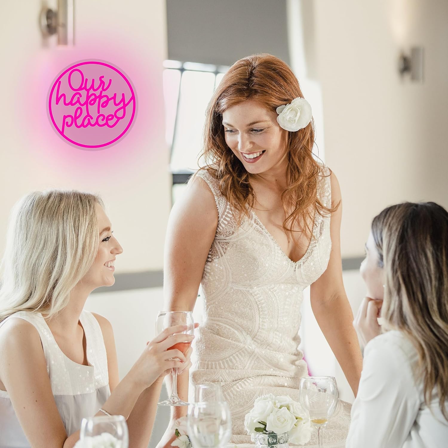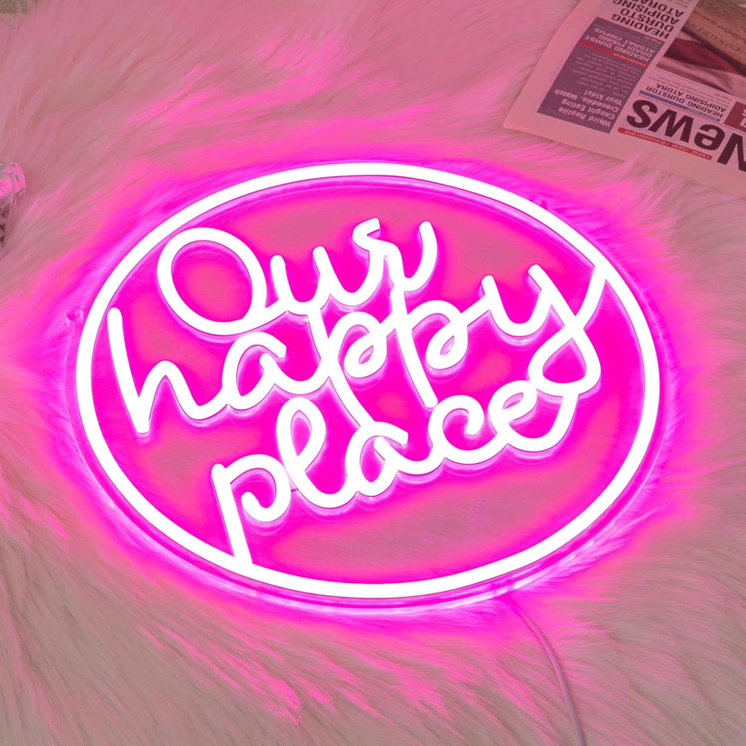 - Happy Neon Sign: Pink neon sign is designed with the phrase “Our happy place”. The color of our happy place neon light is specially designed and unique.