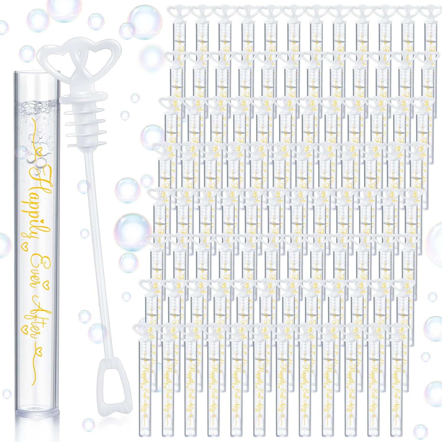 - Romantic Double Heart Design: our bubble tubes feature a charming double heart top design with the words "happy ever after" in the bubble tubes; Further sealed with a rubber stopper, these bubble tubes demonstrate a thoughtfulness that ensures the bubble solution does not leak during transportation and your guests' experience is pleasant