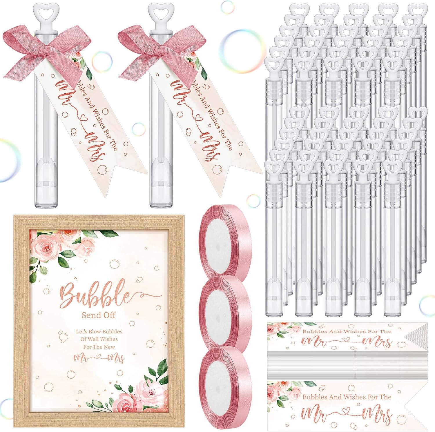 - Wedding Send off Bubbles: the wedding bubbles set contains 200 white heart mini bubble wands, 200 gift tags, 1 bubble send off display card, 1 wood color photo frame and 3 rolls of rose pink ribbon, nice for wedding party favors and wedding farewell bubbles