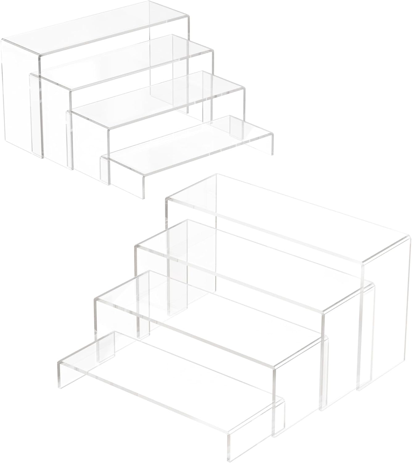 - 【Materials and Size】This black matte metal 8 pieces display stand comes in four sizes, namely 7.8*3*1.2 inches, 8.2*3*2.7 inches, 8.6*3*3.9 inches, 9*3*5.1 inches. Two sets of four sizes of displays stand,simply place the riser on the table, arrange your items, and display them, and you can turn any space into a place to show your personal style and appreciation of art and craftsmanship.