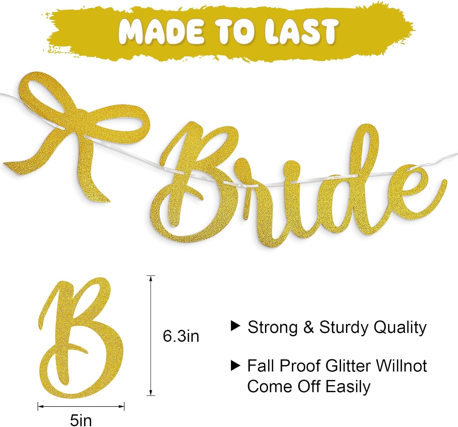 - Bridal Banner Set: This gold bride to be banner set features 9 glittery letters spelling “Bride to Be” along with 2 bow cutouts on each end, each flag measures 5in x 6.3in, bringing a lively, festive vibe to your decor. The elegant shine and trendy hues create a stylish backdrop that’s perfect for capturing unforgettable moments at your bridal shower party decoration and bachelorette party celebration.