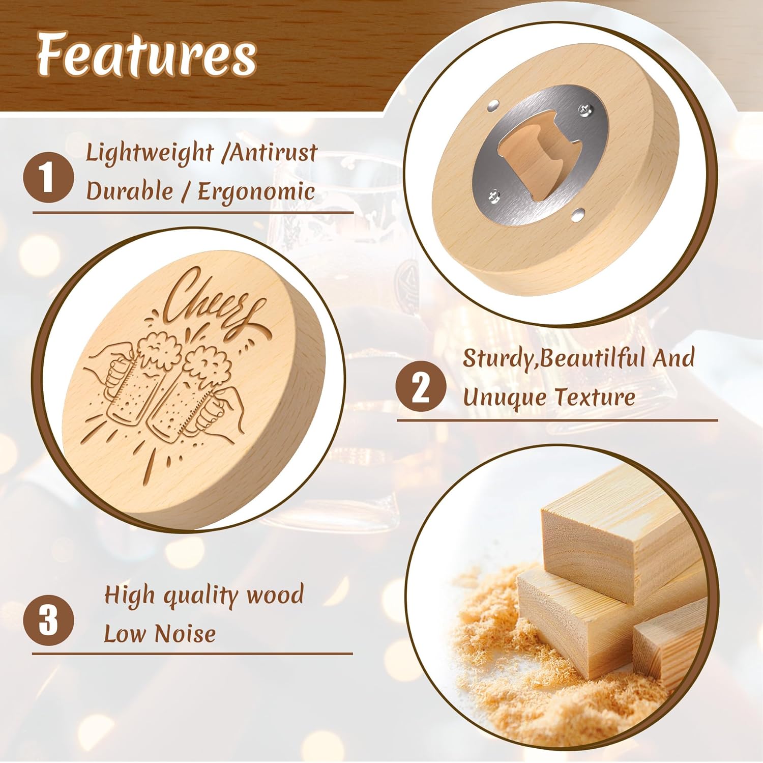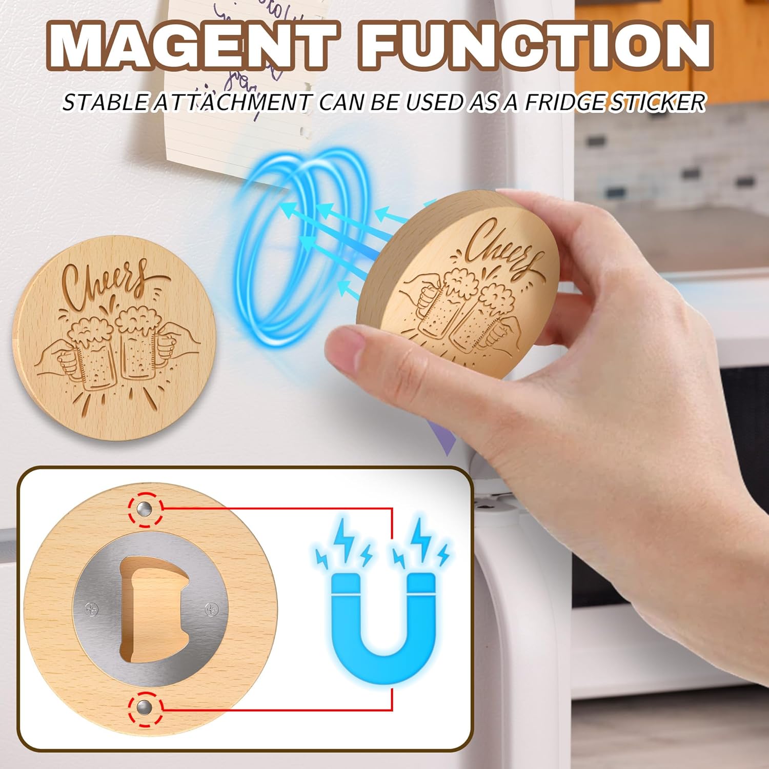 - Durable Magnetic Bottle Opener: The magnetic bottle opener has a diameter of 2.56 inches and a thickness of 0.47 inches, and has a strong magnetic attraction that will not slip off. With the exquisite magnetic design, these bottle openers can be firmly attached to the front and sides of the refrigerator for easy storage.