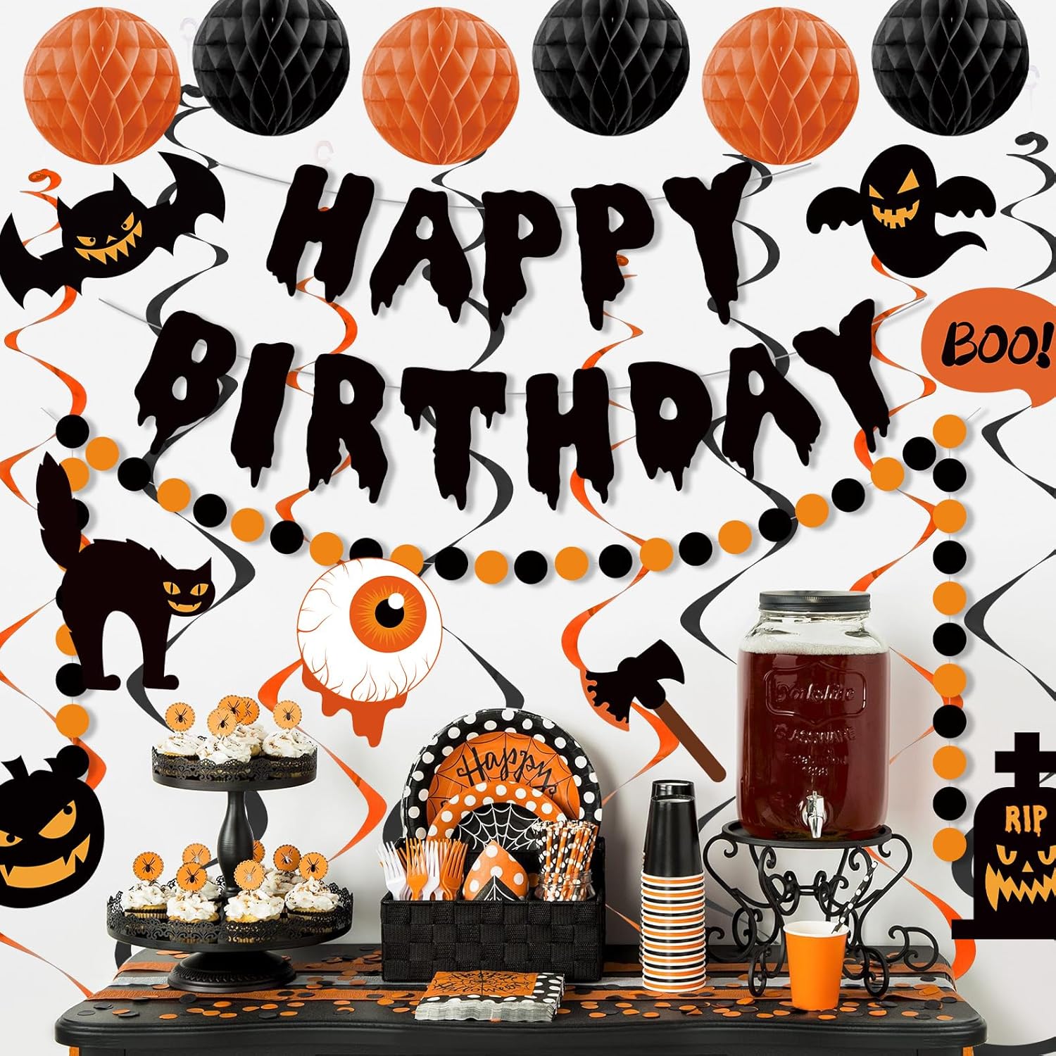 Halloween Birthday Decorations, Happy Birthday Banner for Halloween Party, Kid's Party Decorations with Honeycomb Balls, Hanging Swirl Streamers, Circle Dot Garland